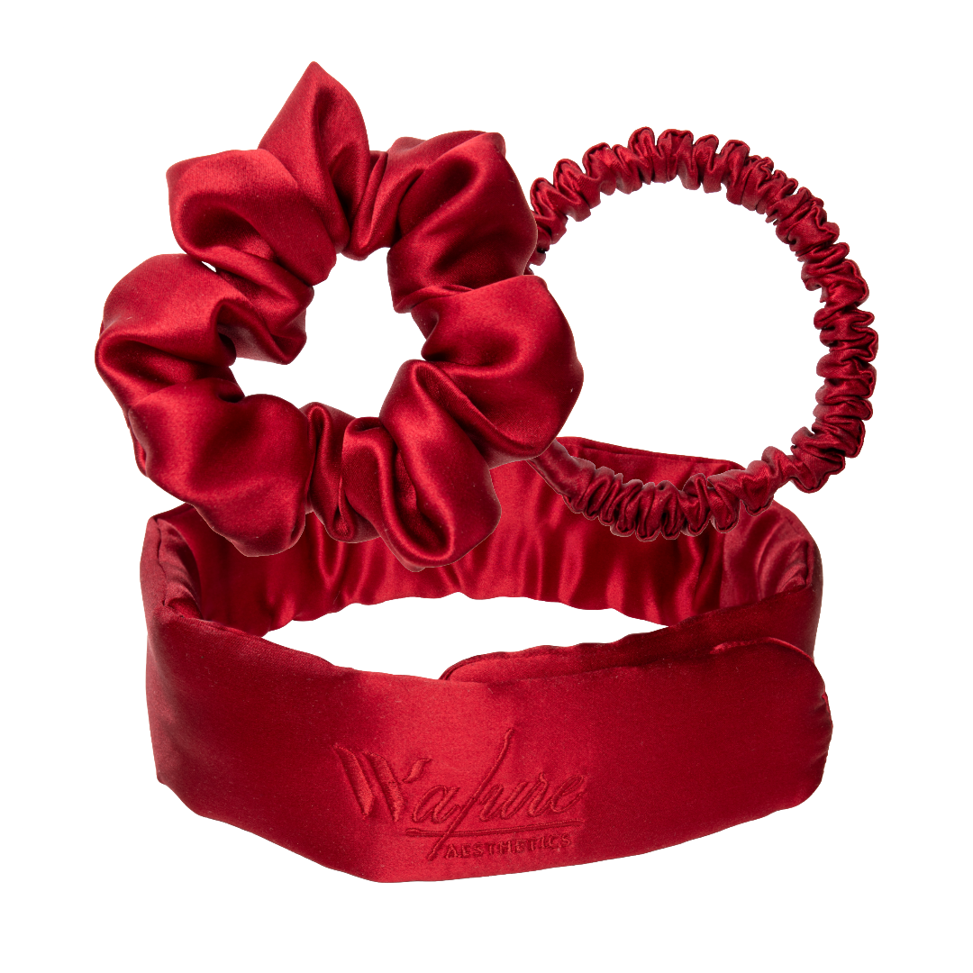 Under the Christmas tree present Lipstick Red includes Premium Silk Hairband + Medium Premium Silk Scrunchie (with or without rhinestones) + Mini Premium Silk Scrunchie